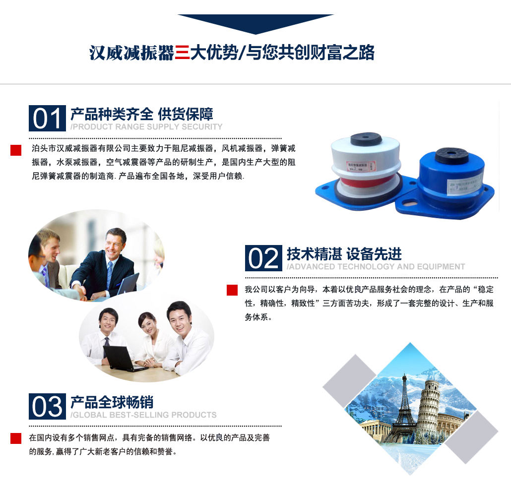 ?泊頭市漢威減振器有限公司主要致力于阻尼減振器,風機減振器,彈簧減振器,水泵減振器,空氣減震器等產(chǎn)品的研制生產(chǎn),是國內(nèi)生產(chǎn)阻尼彈簧減震器的制造商,產(chǎn)品廣泛用于中央空調(diào)、通風管道、鋼鐵、發(fā)電、石化、水泥和城市供熱等行業(yè)的各類管道和設備上,并在全國多地工程上得到應用,業(yè)績遍布全國多地,深受用戶信賴. 公司主要減振器系列產(chǎn)品有:中央空調(diào)系列減振器、泵房系列減振器、管道系列減振器、風機系列減振器、以及自行設計制作的系列隔振臺座。泊頭市漢威減震器科技有限公司擁有多名高素質(zhì)技術(shù)人員,擁有完善的阻尼彈簧減震器生產(chǎn)和檢驗專用設備,擁有硅橡膠自動擠出生產(chǎn)線,全自動彈簧機等設備。生產(chǎn)條件逐漸完善進步,努力擴大生產(chǎn)規(guī)模,提高泊頭市減震器科技有限公司的生產(chǎn)競爭力。 多年來漢威減振器以三誠作為公司的字號,旨在立足當前......